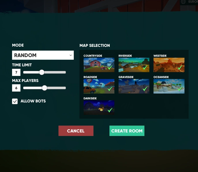A room name will be automatically generated for you. You can select 1 Map, 3 Maps, or all of them. Each consecutive game will randomly play in whichever map options you have chosen. You can choose to play one Game Mode repeatedly or have it randomly change for each consecutive game. The number of players allowed in a room is 2-10 while the number of bots is 0-9.